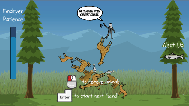“Woodland animals help hapless human!” A physics-based animal-stacking puzzler made during Global Gam Jam 2018, with the theme of “Transmission”. Made in 48 hours with Unity. I was the main programmer on a team with two designers, an artist, and a sound designer.